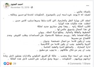 وفي منشورَيْن آخرَيْن، علّق على حالة الفقر في الأردن، وفي أحد المنشورات، زعم حكم المحكمة أنه ألمح إلى أن السلطات الأردنية تعتقل من يُبلغون عن الفساد.