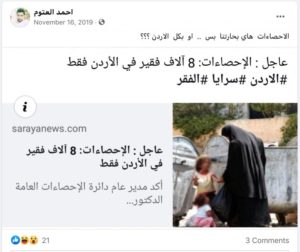 وإعادة نشر أخبار صادرة عن الحكومة على صفحته إلى جانب تعليقات تزعم فساد الحكومة، وإعادة نشر نداءات عبر الإنترنت لمواطنين أردنيين يطلبون مساعدات اجتماعية من الحكومة الأردنية.