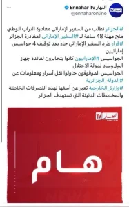 وأوردت ”قناة النهار” الجزائرية أن سلطات الجزائر طلبت من السفير الإماراتي مغادرة التراب الوطني في غضون 48 ساعة على خلفية فضيحة التجسس.
