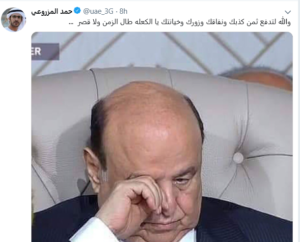 أما المغرد حمد المزروعي الذي لم يسلم منه أذاه أي شعب عربي، فقد رفض بشكل عملي توجيهات الشيخ محمد بن راشد فور الإعلان عن التوجيهات للشعب الإماراتي، عندما شتم الرئيس اليمني في تغريدة، وهو ما يخالف رسالة رئيس مجلس الوزراء.
