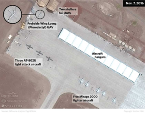 وشوهدت طائرات هليكوبتر هجومية، وطائرات مسيَّرة، وطائرات أخرى على مدرج المطار نفسه.