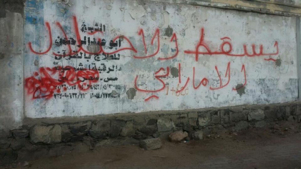 الرفض الشعبي تبلور ضد الوجود العسكري الإماراتي في عدن، ووصل حد وصفه بـ”الاحتلال”، حتى ارتسمت هكذا عبارة في بعض جدران أحياء رئيسية في المدينة الساحلية.