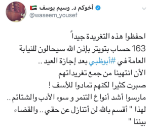 وأضاف: “احفظوا هذه التغريدة جيداً 163 حساب بتويتر بإذن الله سيحالون للنيابة العامة في أبوظبي بعد إجازة العيد”، مشيراً إلى أن “موظفيه قد انتهوا من جمع تغريداتهم”.