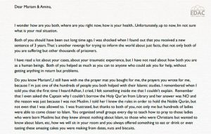 وذكرت الرسالة أن المعتقلتيْن نظمتا داخل السجن مجموعات صغيرة لتعليم الدين الإسلامي ومساعدة معتنقي الديانات الأخرى للتعرف على الإسلام، في وقت كان الحراس يرفضون السماح لغير المسلمين باستعارة القرآن الكريم.