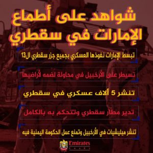 تصر دولة الإمارات على اطماعها في السيطرة على جزيرة سقطري التي تمتاز بموقع استراتيجي في اليمن خاصة مينائها البحري وهو تطور عاد لواجهة حرب التحالف الإجرامية بقيادة السعودية على اليمن.