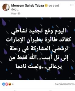 وكتب الطيار “صاحب الطابع” على صفحته على موقع الفيسبوك “تم تجميد نشاطي كقائد طائرة في طيران الإمارات بسبب رفضي المشاركة في رحلة إلى تل أبيب”.