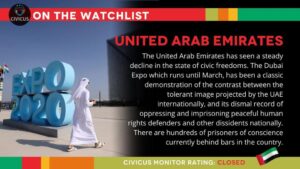 وأدرجت منظمة “سيفيكوس” الحقوقية، دولة الإمارات على قائمة المراقبة الخاصة بحقوق الإنسان بسبب “التراجع المتزايد في حالة الحريات المدنية، والقيود الشديدة التي يفرضها النظام على عمل النشطاء والصحفيين وفئات المجتمع المدني”.