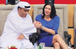 وتظهر في الصورة “ريغيف” وهي تمسك بيد المسؤول الاماراتي بطريقة وصفها نشطاء بالـ”حميمية”، بينما ينظر هو الى ساقيها المكشوفتين.